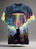 Funny Rainbow UFO Black Cat Print Casual Short-Sleeve T-Shirt