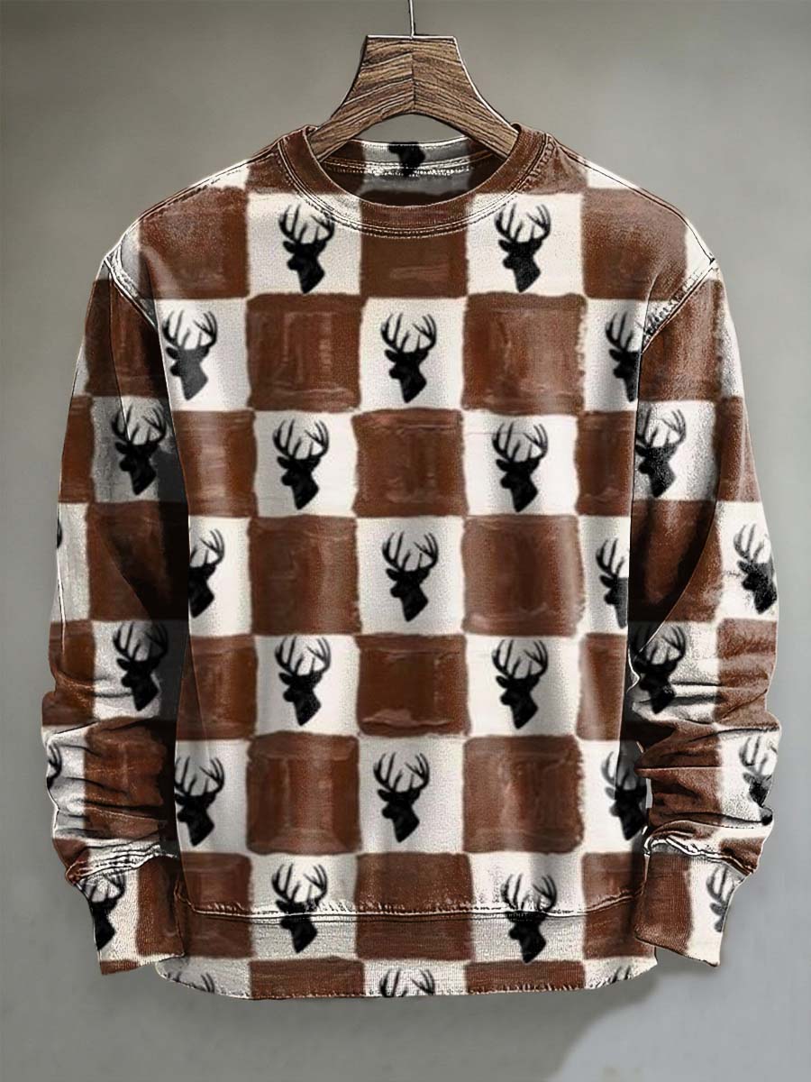Retro Deer Antler Plaid Print Casual Crewneck Sweatshirt